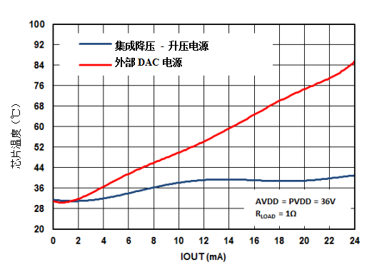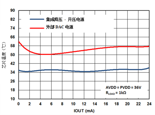 DAC8775的效率也導(dǎo)致需要更多的熱優(yōu)化系統(tǒng)。在具有和不具有自適應(yīng)功率反饋電路的四通道設(shè)計(jì)中比較芯片的結(jié)溫顯示了芯片溫度的顯著改善。圖3和圖4所示為DAC8775的測(cè)量結(jié)果,比較了在1Ω和1kΩ RLOAD情況下,使用和不使用降壓/升壓轉(zhuǎn)換器的模溫。從圖3可以看出,這種技術(shù)可以將結(jié)溫提高至高達(dá)36°C。
