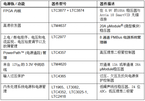 表 1 概述了圖 1 所示 Arria 10 開發套件電路板的電源軌和功能。該表列出了凌力爾特公司的器件,并描述了每種器件的功能。訪問 www.linear.com.cn/altera,點擊 Arria,了解本文所示兩種電路板的詳細技術信息。