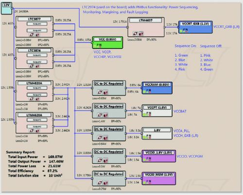 圖 3:用于 Arria 10 GX FPGA 電路板 (圖 1) 的電源樹。用 LTpowerPlanner 設計,該軟件是一款分析性和簡便易用的初步設計工具以用來映射電源要求。