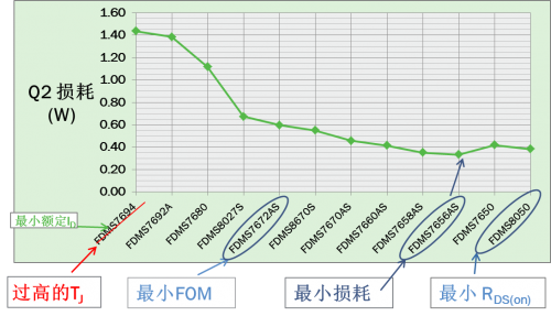 為優化轉換器能效,首先根據VIN選擇損耗最小的Q1,然后選擇產生損耗最小的Q2。本例中, 無論VIN最小或最大,最佳的Q2是相同的,都為FDMS7658AS(但并不總是如此,特別是具有寬VIN范圍或高FSW時)。