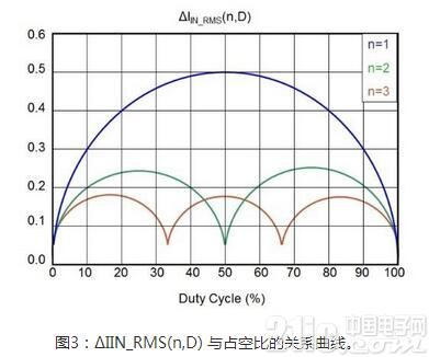 其中,n為相數,L為輸出電感,Fs為開關頻率,k(n,D)=floor(n,D),floor函數的返回值為小于或等于輸入值的最大整數。圖3顯示了ΔIIN_RMS(n,D) 與占空比的關系曲線。