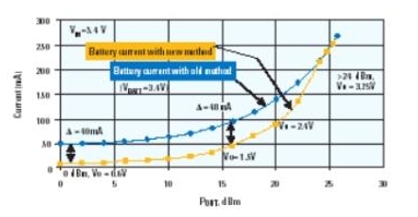 圖3:當功率放大器使用DC-DC轉換器供電時,電池電流的節省情況