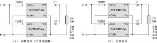 如上圖電路(a)所示,負載需5W功率,超出單個模塊的帶載能力,則其中一個模塊可能存在超負荷使用的情況。對于此種應用,需使用單個大于5W功率的模塊,比如ZY0JGB12P-10W。而電路(b)則不然,每個模塊的功率均能滿足負載的需要,此時屬于冗余設計。