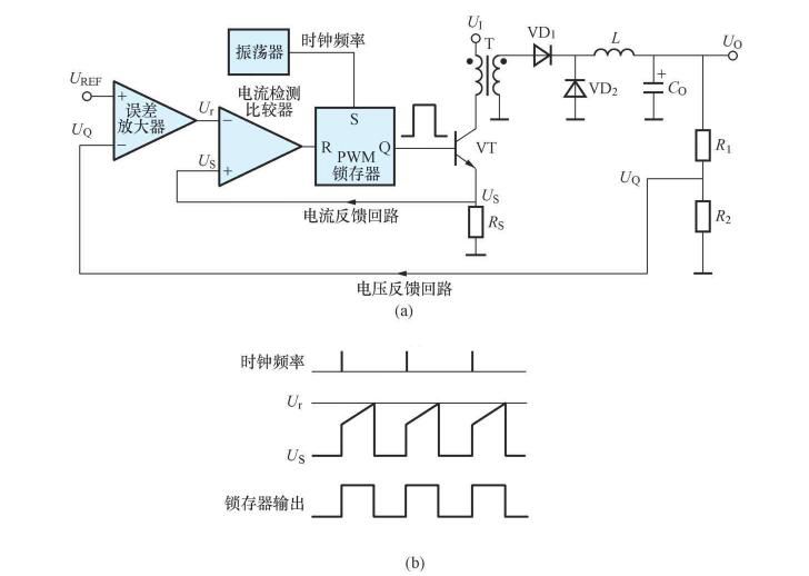 電流控制型是在電壓控制環的基礎上又增加了電流控制環,其基本原理及工作波形分別如圖2 (a)、(b)所示。Us為電流檢測電阻的壓降,此時PWM比較器變為電流檢測比較器。電流控制型需通過檢測電阻來檢測電流,并且可逐個周期的限制電流,便于實現過電流保護。固定頻率的時鐘脈沖將RS鎖存器置位,從Q端輸出的驅動信號為髙電平,使功率開關管VT導通,髙頻變壓器一次側的電流線性地增大。當電流檢測電阻Rs上的壓降達到并超過Ur時,電流檢測比較器翻轉,輸出的高電平將鎖存器復位,從Q端輸出的驅動信號變為低電平,令幵關管關斷,直到下一個時鐘脈沖使RS鎖存器置位。