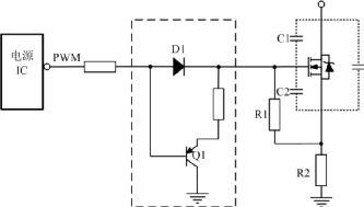 如果選擇MOS管寄生電容比較大,電源IC內部的驅動能力又不足時,需要在驅動電路上增強驅動能力,常使用圖騰柱電路增加電源IC驅動能力,其電路如圖 2虛線框所示。