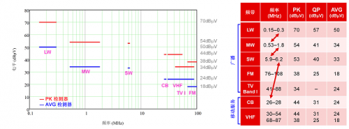 CISPR 25 測試的傳導發射均在 150kHz 至 108MHz 頻率范圍的特定頻帶內進行測量。具體而言,調節頻率范圍分布在 AM 廣播、FM 廣播和移動服務頻帶之間,如圖 2 中的圖象和表格所示。圖 2 還繪制了 CISPR 25 5 類(最嚴苛的要求)的相關限值圖象。盡管頻帶之間的帶隙允許更高的噪聲尖峰,但汽車制造商可能會根據其特定的內部 EMC 要求選擇擴展這些頻率范圍。這些要求通常基于國際 IEC 標準,僅更改不同測試或限值的少量參數,其核心內容保持不變。