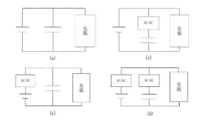 與超級電容配合使用的DCDC,在整車電源中的位置如下圖所示,它可能出現在圖(b)、(c)、(d)中所示位置上,而(b)是應用較多的一種形式。