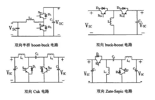 非隔離雙向DCDC,結構比較簡單,每個部件都是直接相連,沒有額外的能量損失,工作效率比較髙。對升壓側的電容要求比較高。主要的非隔離DCDC電路結構有雙向半橋boost-buck電路,雙向buck-boost電路,雙向buck電路,雙向Zate-Sepic電路,如下圖所示。