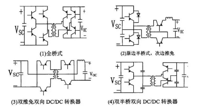 隔離型雙向DCDC,在非隔離型雙向DCDC轉換器的基礎上加上一個高頻變壓器就構成了隔離型雙向DCDC轉換器,高頻變壓器兩側的電路拓撲可以是全橋式、半橋式、推挽式等等。這幾種隔離型的雙向DCDC轉換器,采用了更多的功率開關,電壓變比大,帶電氣隔離等優點。但是這類DCDC轉換器結構復雜,成本也相對較高,轉換器的損耗高,低頻時會導致隔離變壓器鐵芯飽和,損耗會進一步增加。因此,非隔離型雙向DCDC轉換器比隔離型在電動汽車上運用更具有優勢。