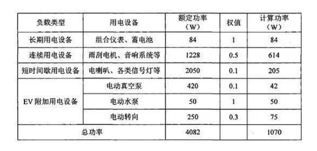 根據純電動汽車車載電子設備的不同屬性,能把用電設備分為長期用電、連續用電、短時間間歇用電和附加用電設備種類型,并賦于不同的權值。其中,長期用電設備包括組合儀表和蓄電池,權值取1;連續用電設備包括雨刮、電機、音響系統和儀表照明等設備,權值可取0.5;短時間間歇用電設備包括電喇機、各類信號燈、控制器等設備,權值可取0.1;附加用電設備電動真空泵、電動水泵和電動轉向,權值根據實際情況分別取0.1、1、0.3。各類設備所消耗功率分析如表所示。